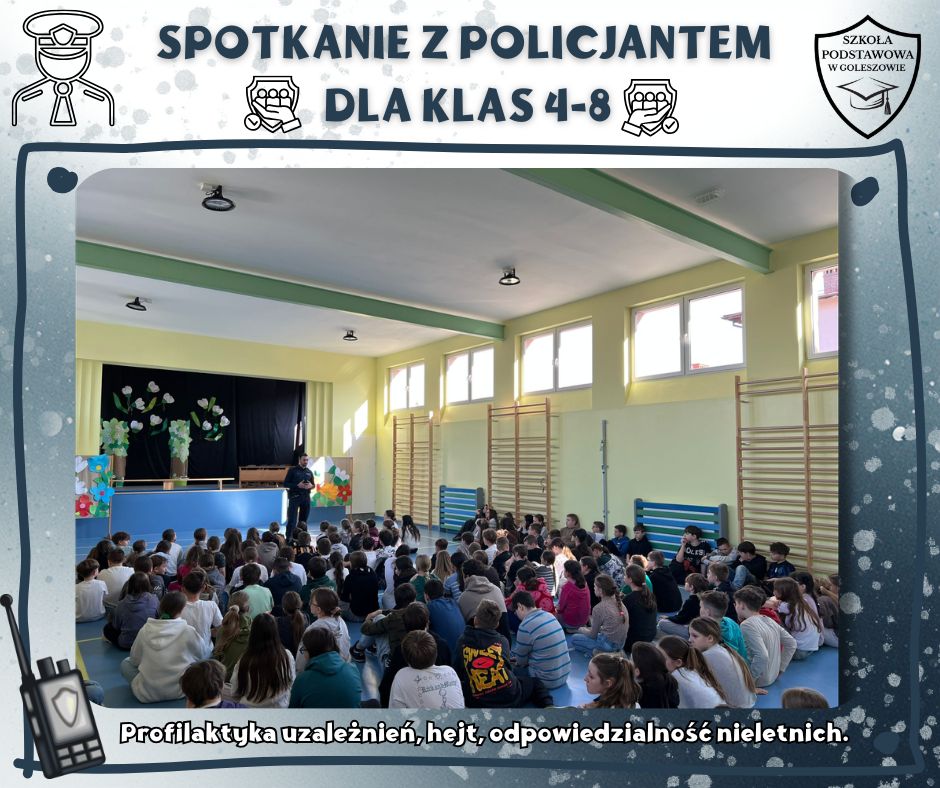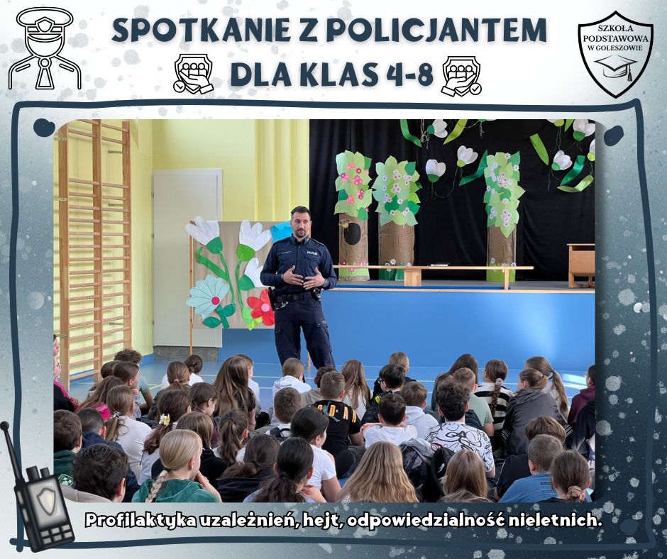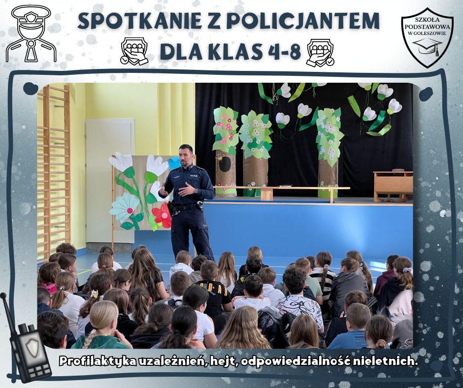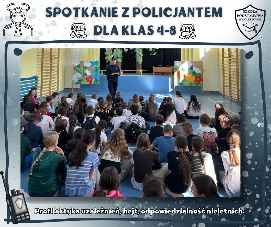 W naszej szkole odbyło się spotkanie uczniów z policjantem, którego tematem było przeciwdziałanie hejtowi, wulgaryzmom oraz innym niewłaściwym zachowaniom, które mogą prowadzić do konfliktów i zagrożeń. Funkcjonariusz zwrócił uwagę na to, jak ważne jest okazywanie sobie wzajemnego szacunku – zarówno w szkole, jak i w internecie.